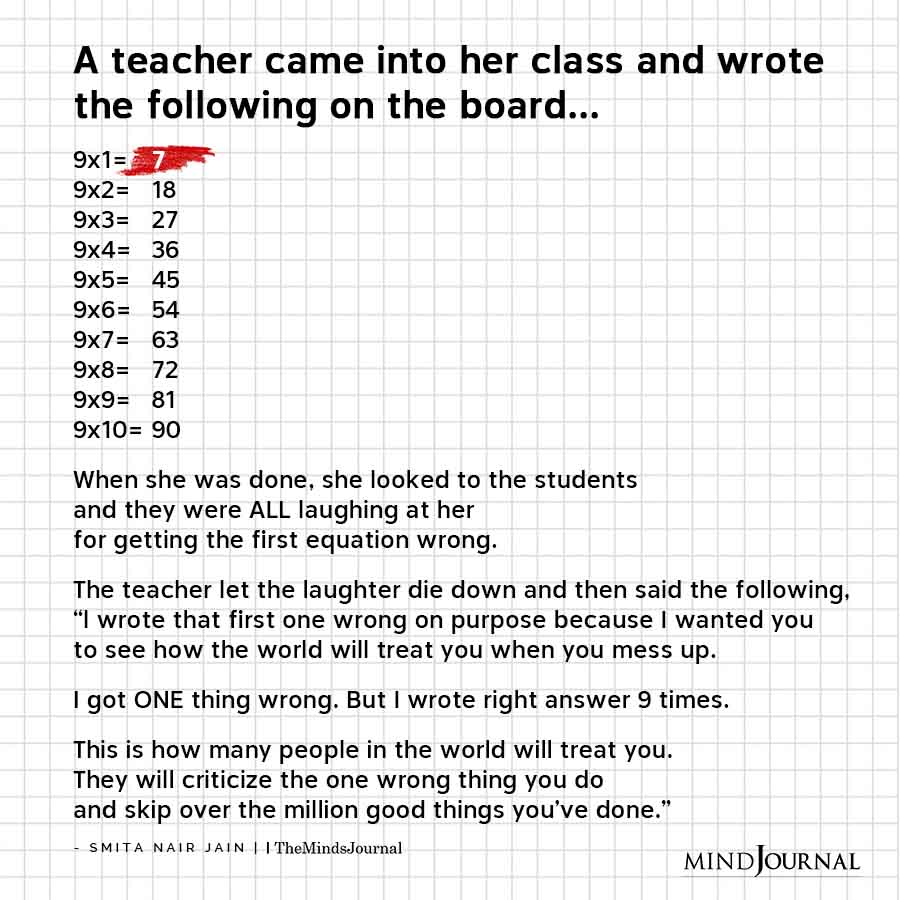 When she was done, she looked to the students and they were ALL laughing at her for getting the first equation wrong. The teacher let the laughter die down and then said the following, “l wrote that first one wrong on purpose because I wanted you to see how the world will treat you when you mess up. I got ONE thing wrong. But I wrote right answer 9 times. This is how many people in the world will treat you. They will criticize the one wrong thing you do and skip over the million good things you’ve done.”