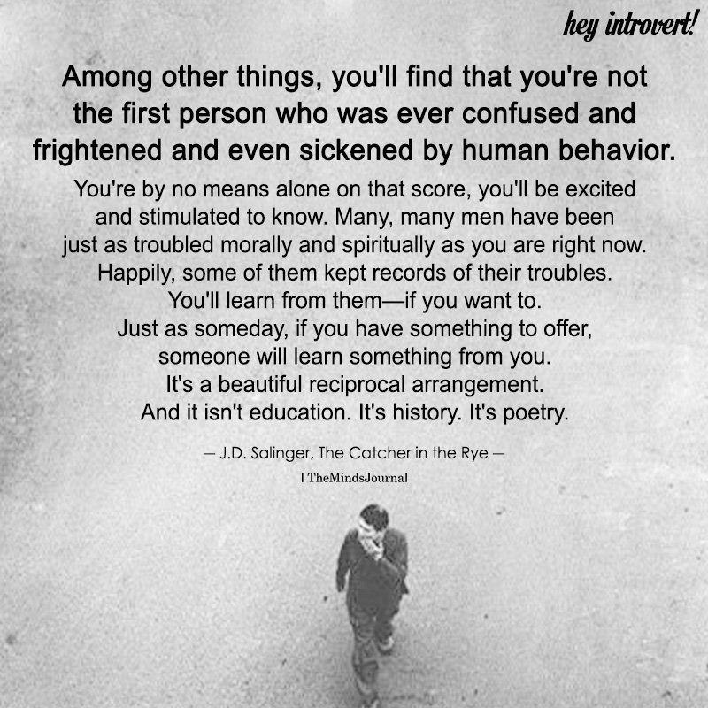 Among other things, you’ll find that you’re not the first person who was ever confused and frightened and even sickened by human behavior. You’re by no means alone on that score, you’ll be excited and stimulated to know. Many, many men have been just as troubled morally and spiritually as you are right now. Happily, some of them kept records of their troubles. You’ll learn from them—if you want to. Just as someday, if you have something to offer, someone will learn something from you. It’s a beautiful reciprocal arrangement. And it isn’t education. It’s history. It’s poetry.