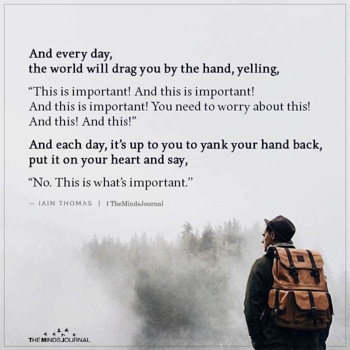 “And every day, the world will drag you by the hand, yelling, “This is important! And this is important! And this is important! You need to worry about this! And this! And this!” And each day, it’s up to you to yank your hand back, put it on your heart and say, “No. This is what’s important.”
