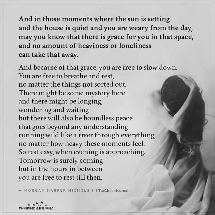And in those moments where the sun is setting and the house is quiet and you are weary from the day, may you know that there is grace for you in that space, and no amount of heaviness or loneliness can take that away. And because of that grace, you are free to slow down. You are free to breathe and rest, no matter the things not sorted out. There might be some mystery here and there might be longing, wondering and waiting but there will also be boundless peace that goes beyond any understanding running wild like a river through everything, no matter how heavy these moments feel. So rest easy, when evening is approaching. Tomorrow is surely coming but in the hours in between you are free to rest till then.