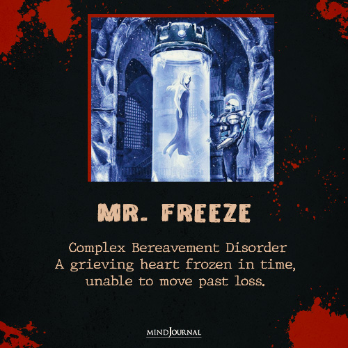 Mr. Freeze is powered by grief, not malice. Complex Bereavement Disorder traps him in a frozen moment of loss, making him unable to move forward after losing his wife. His villainy stems from love that’s become desperation.