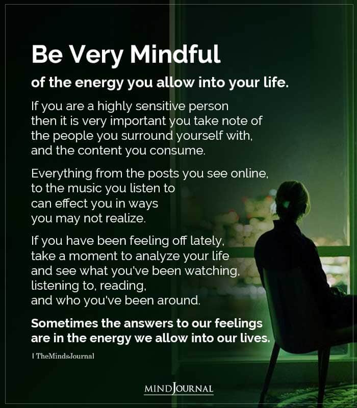 Be Very Mindful… of the energy you allow into your life. If you are a highly sensitive person then it is very important you take note of the people you surround yourself with, and the content you consume. Everything from the posts you see online, to the music you listen to can effect you in ways you may not realize. If you have been feeling off lately, take a moment to analyze your life and see what you’ve been watching, listening to, reading, and who you’ve been around. Sometimes the answers to our feelings are in the energy we allow into our lives.