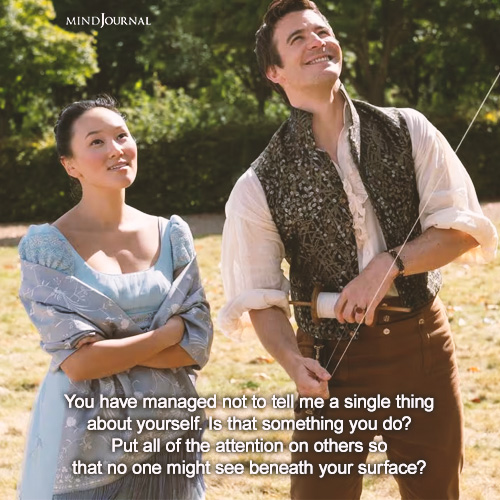 2. โYou have managed not to tell me a single thing about yourself. Is that something you do? Put all of the attention on others so that no one might see beneath your surface?โ