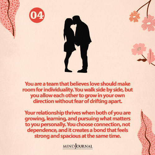 You love each other a lot, but you donโt need to merge identities to feel connected. You may have separate interests, friend circles, or goals, and instead of pulling you apart, it makes your bond stronger.