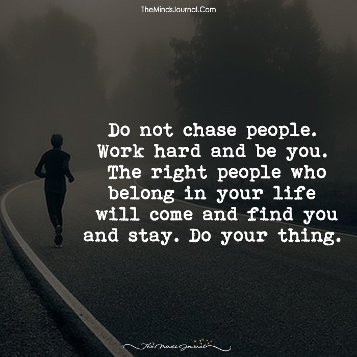 Do not chase people. Work hard and be you. The right people who belong in your life will come and find you and stay. Do your thing.