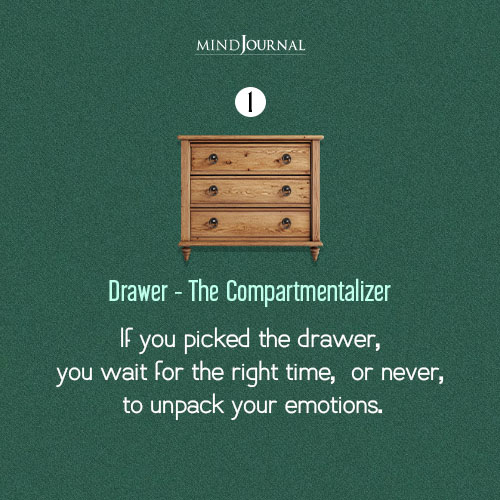 If you picked the drawer, you tend to manage emotions with logic. When life feels messy, you prefer to keep things neatly contained, separating your feelings into mental โfolders.โ You rarely show everything at once, instead, you wait for the right time, or never, to unpack them.