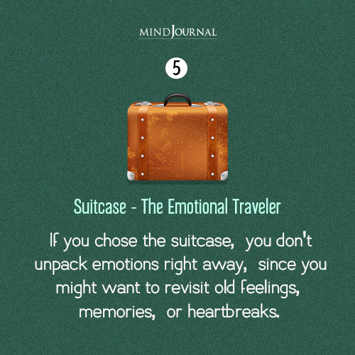 If you chose the suitcase, you carry your emotions wherever you go. You donโt always unpack them right away, but theyโre never far behind. You might revisit old feelings, memories, or heartbreaks long after others have moved on.