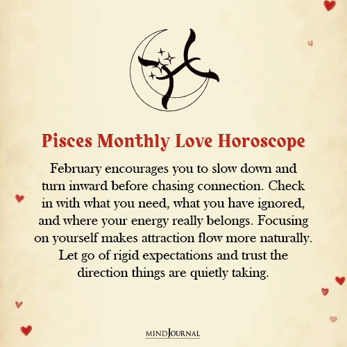 February slows you down in a good way, Pisces. Instead of chasing connection, you are being nudged to check in with yourself first, be it what you need, what you have been ignoring, where your energy actually wants to go.