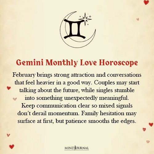 February brings intense attraction and thoughtful conversations, Gemini. People who are in a relationship may find themselves discussing future plans more openly, while singles could stumble upon a connection that feels exciting and unexpectedly serious.