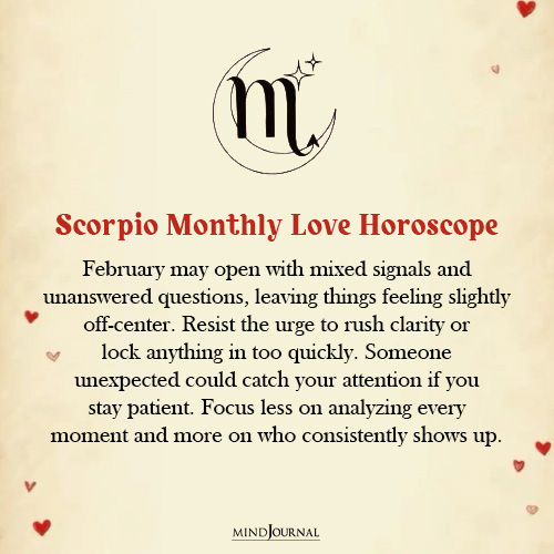February might start off a little fuzzy in the love department, Scorpio. Mixed signals, unanswered questions, that nagging sense that something isn’t fully clear yet.