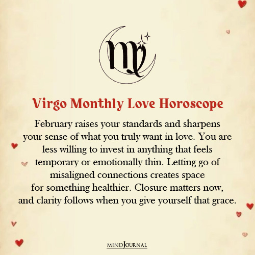 February invites you to raise your standards, Virgo. You are no longer interested in relationships that lack a future or emotional substance.