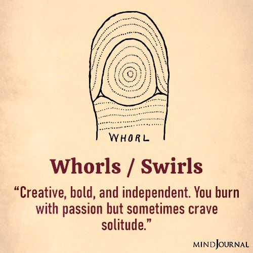 A circular print reveals the energy of Fire. If you have the swirl fingerprint personality then you’re someone who is passionate, driven, and capable of turning vision into reality. You thrive when pursuing your own ideas, and your creativity and determination often inspire the people around you.
