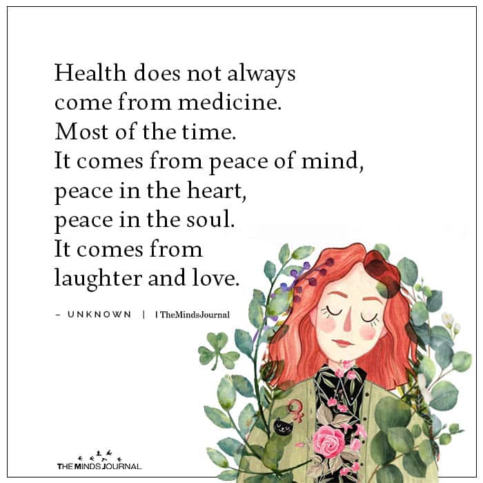 Health does not always come from medicine. Most of the time. It comes from peace of mind, peace in the heart, peace in the soul. It comes from laughter and love.