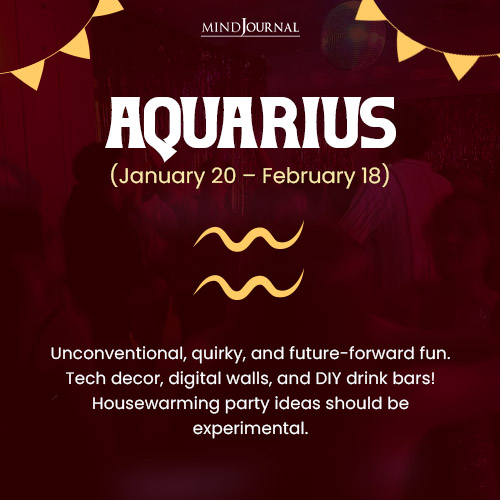 For this individualistic and future-focused sign, the housewarming theme must be eclectic and modern. They can set up a make-your-own drink station or a digital message wall for the guests. Decorations need to include futuristic elements, tech gadgets, unique art, and LED lights. Their E-invites must read: “This isnโ€™t just a house, itโ€™s an experiment in fun, freedom, and flair. You in?”