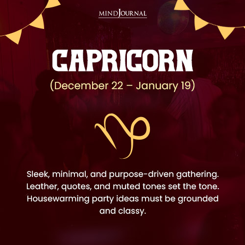 For this goal-oriented sign, a simple and minimalistic theme would work well. They must add a toast moment to reflect on growth and achievements. Their housewarming decorations must have leather furniture, sleek neutral colors, framed quotes, and tidy shelves. Their housewarming invitations must be mailed and RSVPed. The text would say: “Hereโ€™s to new goals, new beginnings, and a home built with intention. Youโ€™re invited to celebrate with purpose.”