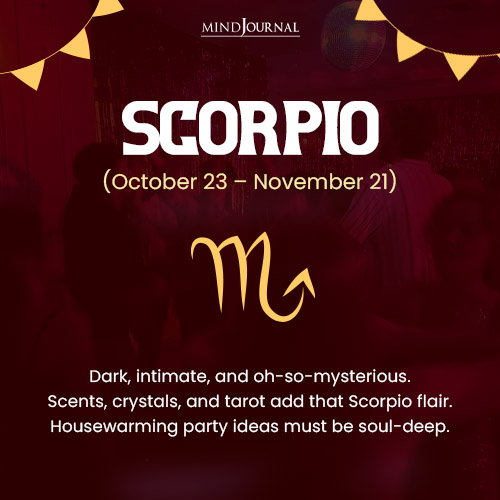 This deep, dark, and secretive sign would appreciate an intimate and mysterious gathering of a handful of people who are really close to them. They must use scents like patchouli or sandalwood to set the tone and add a tarot or any other mystic/fortune telling corner. The housewarming decorations must be planned keeping in mind dark colors, moody lighting, crystals or incense. Housewarming invitations wording would be: “A new sanctuary awaits. Come share in the mystery, magic, and memory-making.”