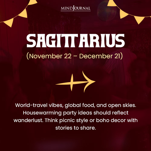 For this adventurous sign, global and travel themed housewarming party ideas would be apt. They can host a dinner with global cuisine or an outdoor picnic-style party. For housewarming decorations, travel souvenirs, boho accents, and bright textiles would be perfect. Their housewarming invitations should read: “Come wander through my new space. No passport required! Letโ€™s make this house a home with stories and laughs.”