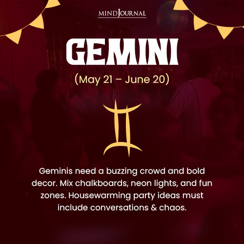 This social and eloquent sign needs a dynamic party theme and a huge crowd of a diverse profile of invitees. Their place should be buzzing with bright colors, chalkboards, fun signage, and a mix of light and dark ambience, perfect for their dual nature. As for decorations, they can set up conversation corners, a DIY photo booth, or a โ€œchoose your vibeโ€ playlist. Their housewarming invitations should read: “New space, new conversations, same fun vibes! Come mingle, munch, and make memories.”