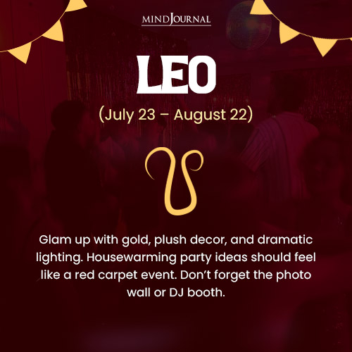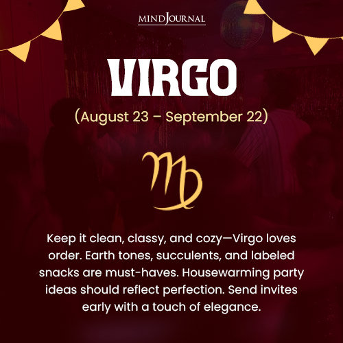This practical and perfectionist sign must throw a housewarming party thatโ€™s well-organized and solemn. They should serve healthy snacks and offer thoughtful party favors like handmade soaps or mini plants. Housewarming decorations include earth tones, succulents, minimalist decor, and labeled food stations. Their housewarming invitations must reach the guests one week in advance and it must read like this: “Iโ€™ve got every detail covered. Join me for a clean, classy, and cozy celebration of my new space.”
