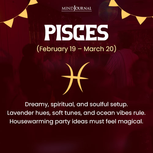 For this intuitive and imaginative sign, a dreamy and spiritual themed party would be best. They must play ambient music and offer tea, mocktails, or journaling prompts. And for decorations, how about lavender hues, ocean-inspired touches, crystals, and soft music? Their invitation wording would be: “Step into my dreamy new space and help me fill it with light, love, and laughter.”