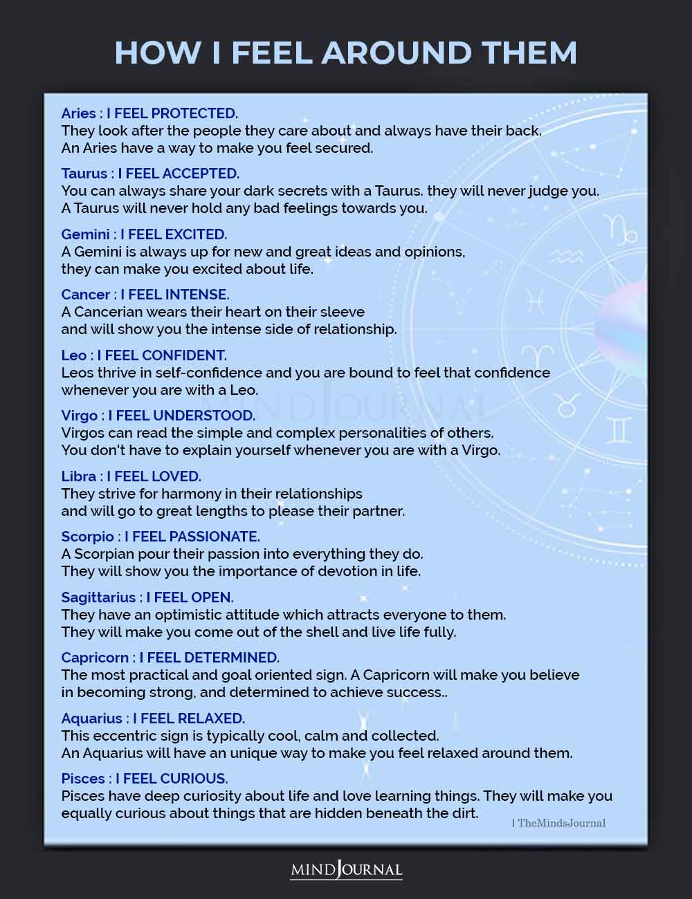 Aquarius: I feel Relaxed. This eccentric sign is typically cool, calm and collected. An Aquarius will have an unique way to make you feel relaxed around them.