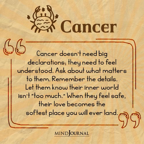 If you are figuring out how to make zodiac signs feel special, know that Cancer blooms under emotional safety. Their zodiac signs love language is tenderness, like listening, remembering, nurturing.
