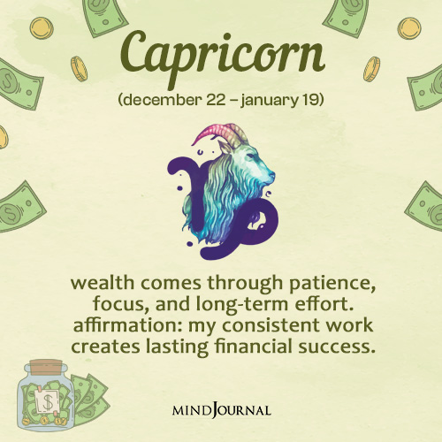 You manifest money best through patience and discipline. This month rewards career focus, goal-setting, and taking responsibility for your financial future. Progress may feel slow but it’s solid.