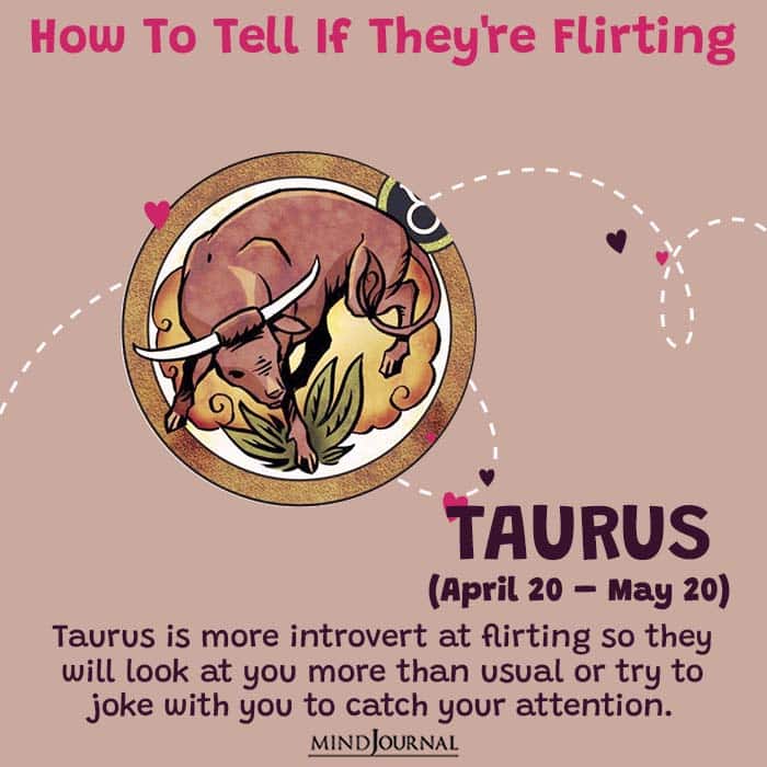 Taurus is more introverted at flirting. Usually, they engage more with the person they are interested in than they do with other people. Search for signs of non-verbal communication,