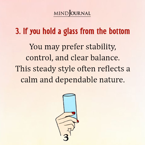 Supporting the glass from underneath hints at a preference for control, balance, and reliability. This careful glass holding suggests composure and thoughtful decision-making.