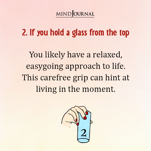 Some people casually grab their drink from the top. This relaxed glass holding style often reflects an easygoing, present-moment attitude. If this is your natural habit, you likely focus on enjoyment rather than overthinking small details.