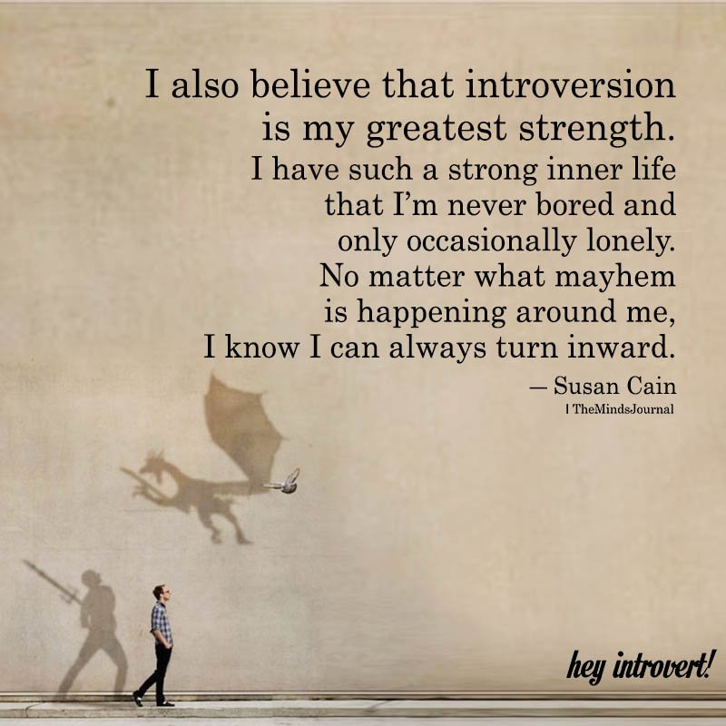 I also believe that introversion is my greatest strength. I have such a strong inner life that I’m never bored and only occasionally lonely. No matter what mayhem is happening around me, I know I can always turn inward.
