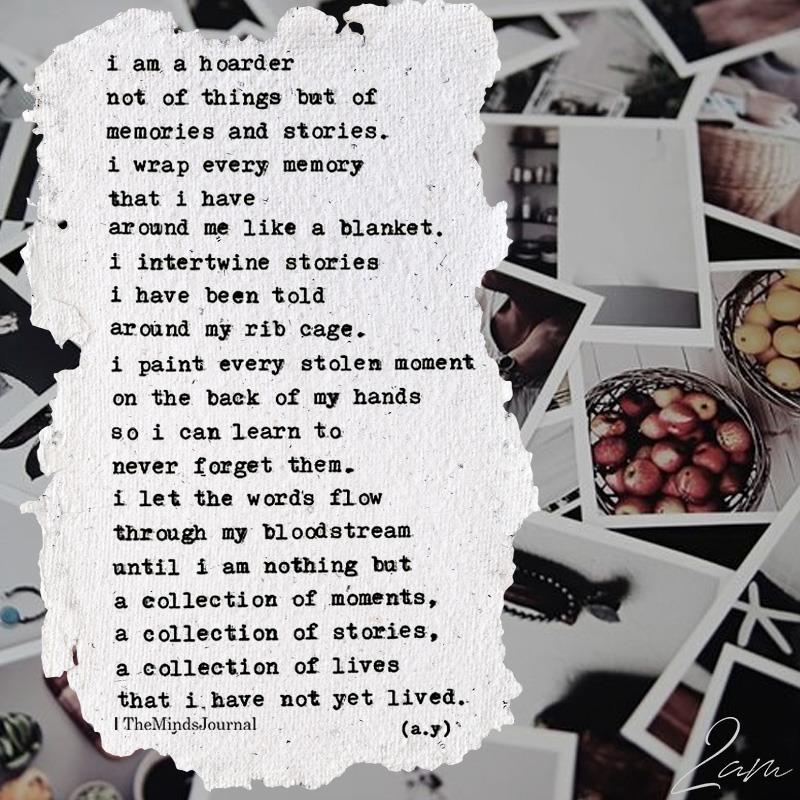 I am a hoarder not of things but of memories and stories. i wrap every memory that i have around me like a blanket. intertwine stories have been told around my rib cage. i paint every stolen moment on the back of my hands so i can learn to never forget them. i let the words flow through my bloodstream until i am nothing but a collection of moments, a collection of stories, a collection of lives that I have not yet lived.