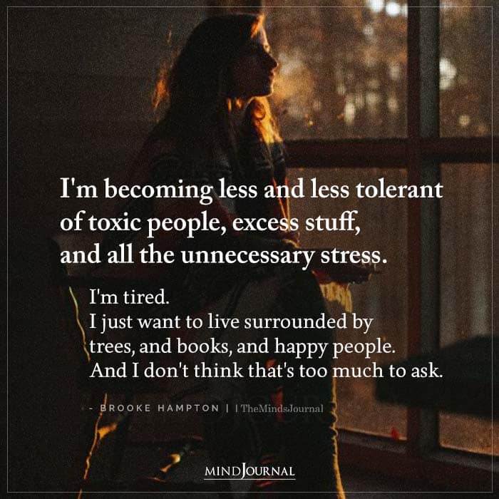 I’m becoming less and less tolerant of toxic people, excess stuff, and all the unnecessary stress. I’m tired. I just want to live surrounded by trees, and books, and happy people. And I don’t think that’s too much to ask.