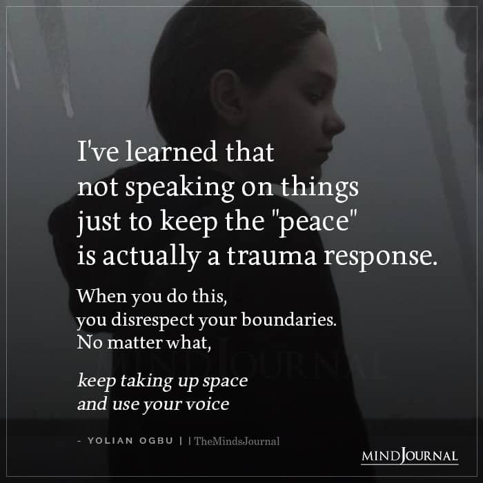 I’ve learned that not speaking on things just to keep the “peace” is actually a trauma response. When you do this, you disrespect your boundaries. No matter what, keep taking up space and use your voice.
