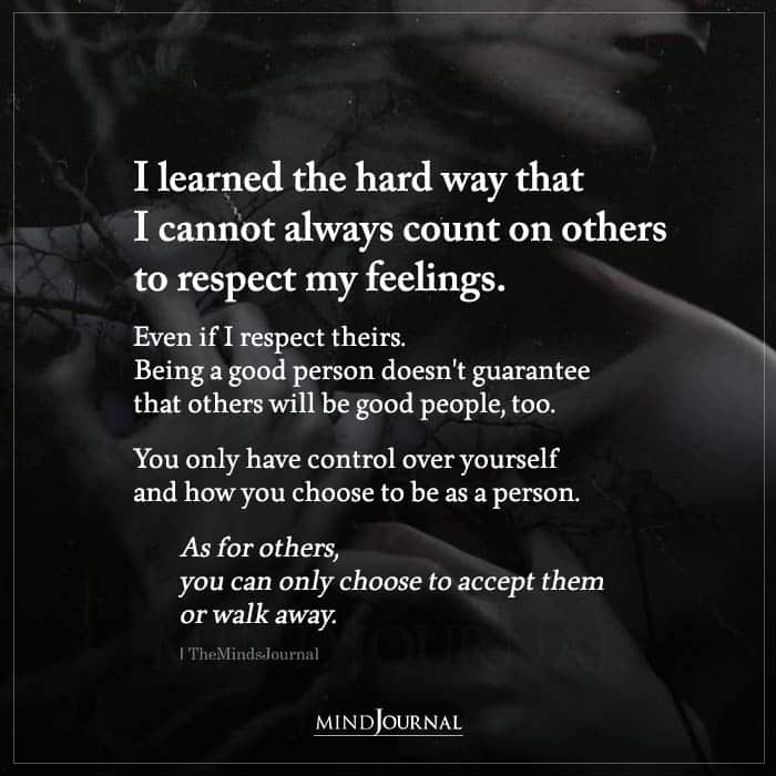 I learned the hard way that I cannot always count on others to respect my feelings. Even if I respect theirs. Being a good person doesn’t guarantee that others will be good people, too. You only have control over yourself and how you choose to be as a person. As for others, you can only choose to accept them or walk away.