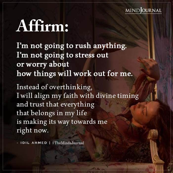 Affirm: I’m not going to rush anything. I’m not going to stress out or worry about how things will work out for me. Instead of overthinking, I will align my faith with divine timing and trust that everything that belongs in my life is making its way towards me right now.