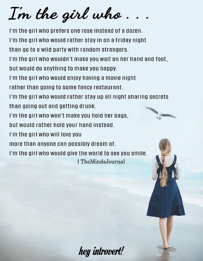 I’m the girl who prefers one rose instead of a dozen. I’m the girl who would rather stay in on a Friday night than go to a wild party with random strangers. I’m the girl who wouldn’t make you wait on her hand and foot, but would do anything to make you happy. I’m the girl who would enjoy having a movie night rather than going to some fancy restaurant. I’m the girl who would rather stay up all night sharing secrets than going out and getting drunk. I’m the girl who won’t make you hold her bags, but would rather hold your hand instead. I’m the girl who will love you more than anyone can possibly dream of. I’m the girl who would give the world to see you smile.