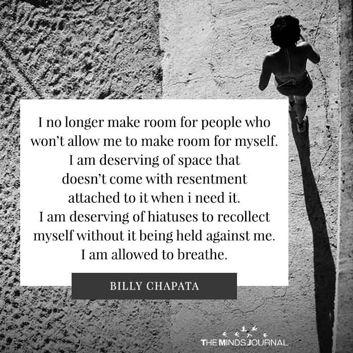 I no longer make room for people who won’t allow me to make room for myself. I am deserving of space that doesn’t come with resentment attached to it when I need it. I am deserving of hiatuses to recollect myself without it being held against me. I am allowed to breathe.