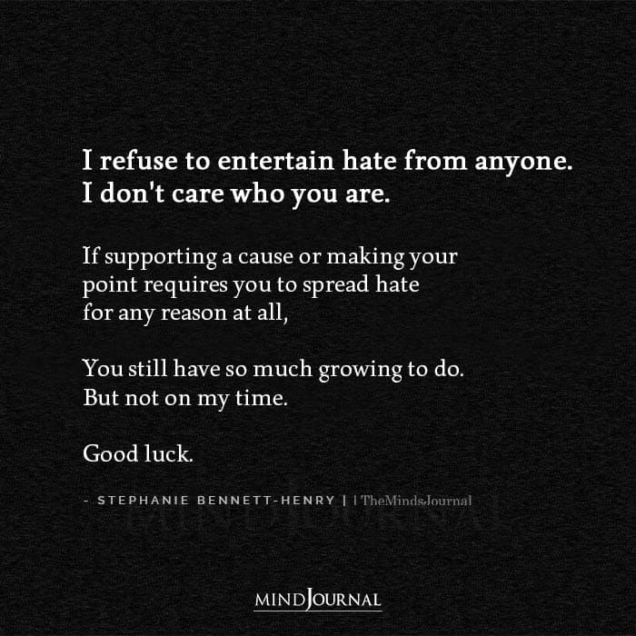I refuse to entertain hate from anyone. I don’t care who you are. If supporting a cause or making your point requires you to spread hate for any reason at all, You still have so much growing to do. But not on my time. Good luck.