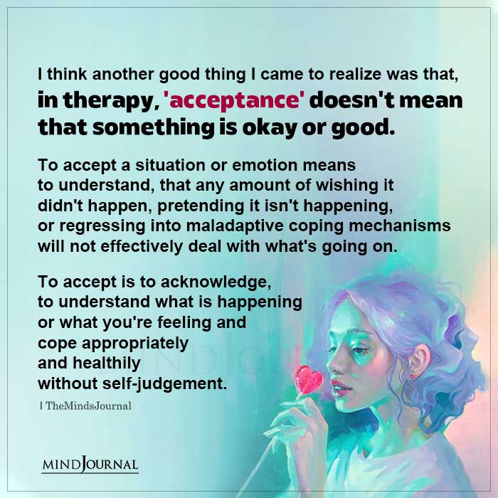 I think another good thing I came to realize was that, in therapy, ‘acceptance’ doesn’t mean that something is okay or good.