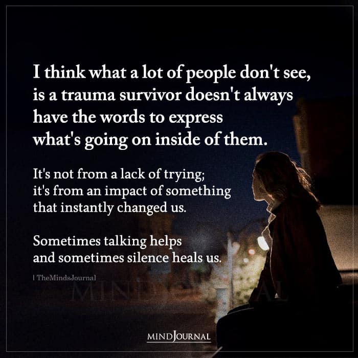 I think what a lot of people don’t see, is a trauma survivor doesn’t always have the words to express what’s going on inside of them. It’s not from a lack of trying; it’s from an impact of something that instantly changed us. Sometimes talking helps and sometimes silence heals us.