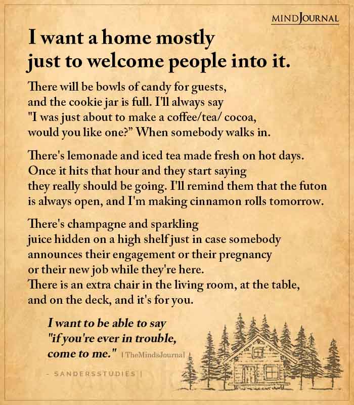 I want a home mostly just to welcome people into it. There will be bowls of candy for guests, and the cookie jar is full. I’ll always say “I was just about to make a coffee/tea/ cocoa, would you like one?” When somebody walks in. There’s lemonade and iced tea made fresh on hot days. Once it hits that hour and they start saying they really should be going. I’ll remind them that the futon is always open, and I’m making cinnamon rolls tomorrow. There’s champagne and sparkling juice hidden on a high shelf just in case somebody announces their engagement. or their pregnancy or their new job while they’re here. There is an extra chair in the living room, at the table, and on the deck, and it’s for you. I want to be able to say “if you’re ever in trouble, come to me.”