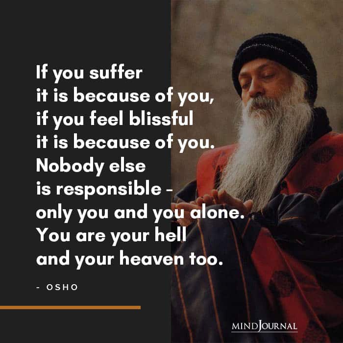 If you suffer it is because of you, if you feel blissful it is because of you. Nobody else is responsible – only you and you alone. You are your hell and your heaven too.