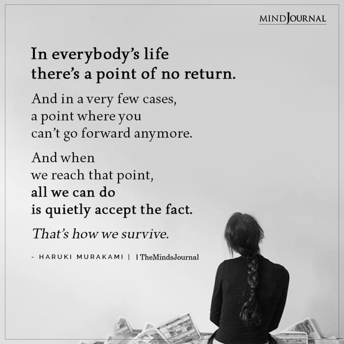 “In everybody’s life, there’s a point of no return. And in a very few cases, a point where you can’t go forward anymore. And when we reach that point, all we can do is quietly accept the fact. That’s how we survive.”