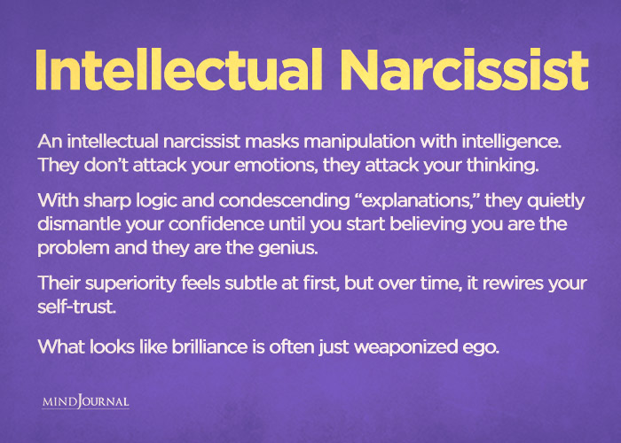 Unlike overt narcissists who yell or bully, intellectual narcissists are subtle. They talk in slow, condescending tones. They speak as if they are explaining something to a child. They use complex vocabulary when simple words would do.