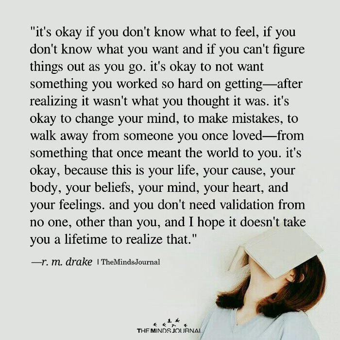 IT’S OKAY IF YOU DON’T KNOW WHAT TO FEEL IF YOU DON’T KNOW WHAT YOU WANT AND IF YOU CAN’T FIGURE OUT THINGS AS YOU GO IT’S OKAY TO NOT WANT SOMETHING YOU WORKED SO HARD ON GETTING – AFTER REALIZING IT ISN’T WHAT YOU THOUGHT IT WAS IT’S OKAY TO CHANGE YOUR MIND TO MAKE MISTAKES TO WALK AWAY FROM SOMEONE YOU ONCE LOVED – FROM SOMETHING THAT ONCE MEANT THE WORLD TO YOU IT’S OKAY BECAUSE THIS IS YOUR LIFE YOUR CAUSE YOUR BODY YOUR BELIEfS YOUR MIND YOUR HEART AND YOUR FEELINGS AND YOU DON’T NEED VALIDATION FROM No ONE OTHER THAN YOU AND I HOPE IT DOESN’T TAKE YOU A LIFETIME TO REALIZE THAT.