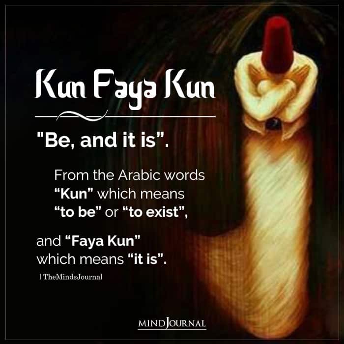 Kun Faya Kun: “Be, and it is”. From the Arabic words “Kun” which means “to be” or “to exist”, and “Faya Kun” which means “it is”.