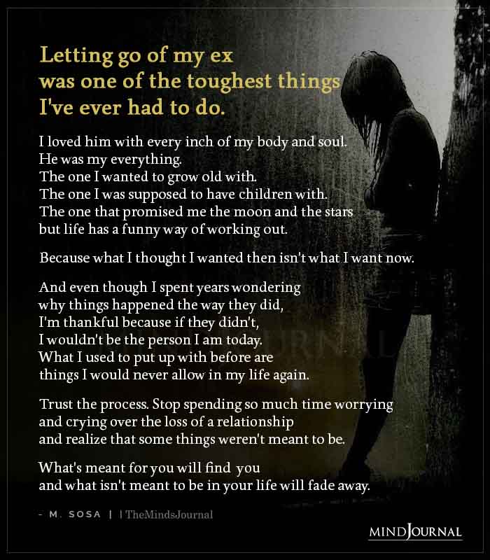 Letting go of my ex was one of the toughest things I’ve ever had to do. I loved him with every inch of my body and soul. He was my everything. The one I wanted to grow old with. The one I was supposed to have children with. The one that promised me the moon and the stars but life has a funny way of working out. Because what I thought I wanted then isn’t what I want now. And even though I spent years wondering why things happened the way they did, I’m thankful because if they didn’t, I wouldn’t be the person I am today. What I used to put up with before are things I would never allow in my life again. Trust the process. Stop spending so much time worrying and crying over the loss of a relationship and realize that some things weren’t meant to be. What’s meant for you will find you and what isn’t meant to be in your life will fade away.