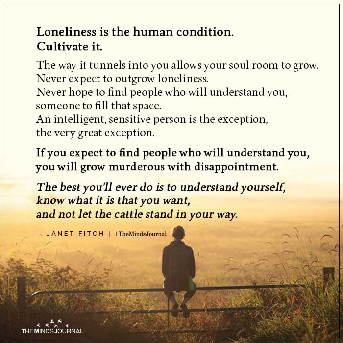 Loneliness is the human condition. Cultivate it. The way it tunnels into you allows your soul room to grow. Never expect to outgrow loneliness. Never hope to find people who will understand you, someone to fill that space. An intelligent, sensitive person is the exception, the very great exception. If you expect to find people who will understand you, you will grow murderous with disappointment. The best you’ll ever do is to understand yourself, know what it is that you want, and not let the cattle stand in your way.