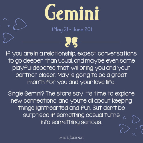 If you are in a relationship, expect conversations to go deeper than usual, and maybe even some playful debates that will bring you and your partner closer. May is going to be a great month for you and your love life.